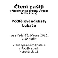 Číst pašije (velikonoční příběh Ježíšova utrpení) budeme letos číst podle Lukáše, v evangelickém kostele v Poděbradech. Zájemci, kteří by chtěli část přečíst, se mohou ozvat na sborové kontakty.