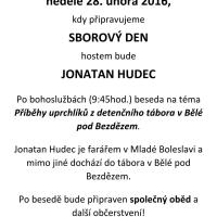 Jonatan Hudec je farář v Mladé Boleslavi a dojíždí také do detenčního tábora pro cizince v Bělé pod Bezdězem. Při bohoslužbách bude kázat a po nich bude beseda, kde bude mluvit o svých zkušenostech z tohoto tábora. Následovat bude společný oběd. Srdečně zveme ke společnému strávení neděle!