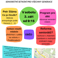 V sobotu 3. září budeme hostit tradiční seniorátní setkání pro všechny generace - Polabskou evangelickou pouť. Na programu je přednáška Petra Slámy na téma Co je člověk? Biblická antropologie podle Genezis 1 -11. Poté bude beseda s Adamem Csukásem na téma plánované erformy seniorátů.