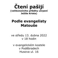 Příběh Ježíšova utrpení a jeho smrti si připomínáme pravidelně také při čtení pašijí. Tentokrát ve středu 13. dubna od 18 hodin - po dvou letech opět "normálně" - tedy společně, v kostele. Budeme číst pašije