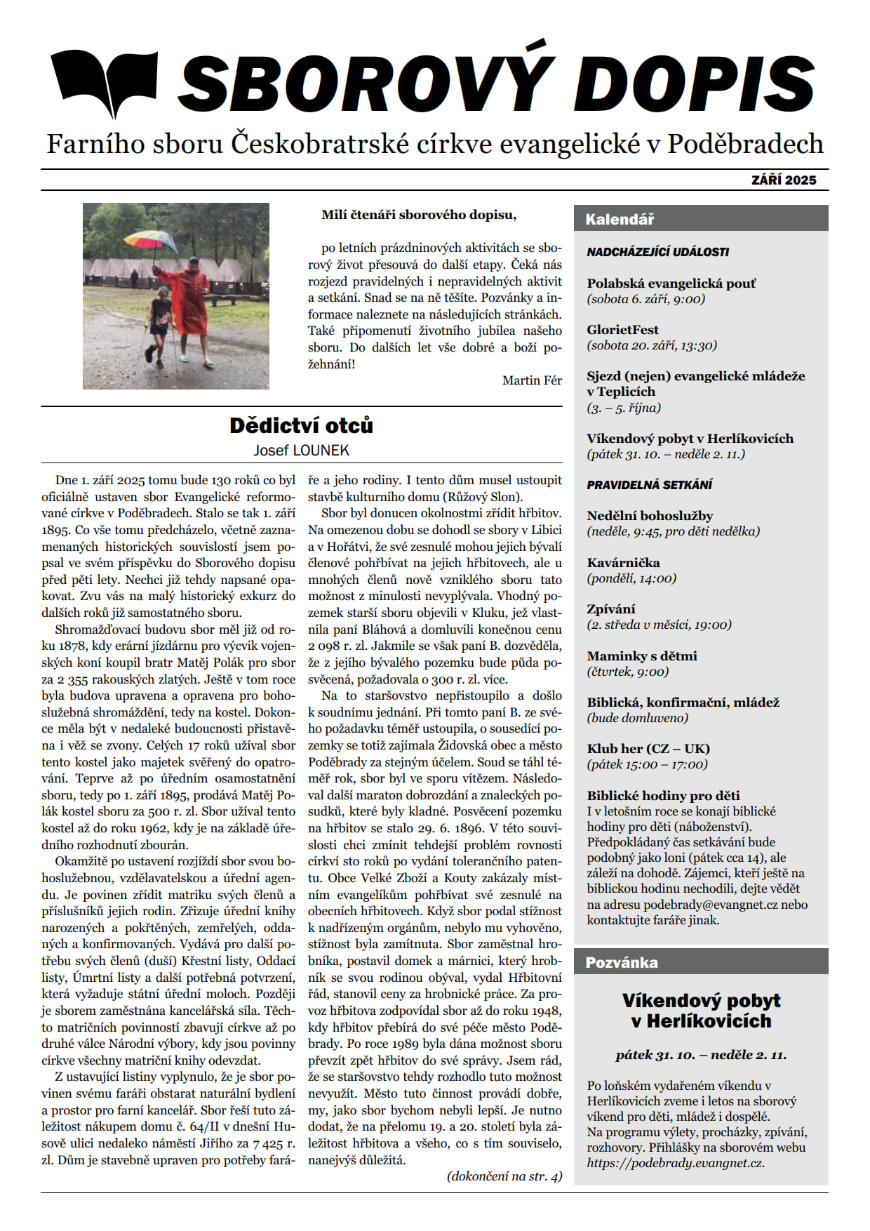 Ve sborovém dopise na září naleznete přehled nadcházejících událostí, informace ze sboru, připomenutí 130. výročí založení sboru, vyhlášení mimořádné sbírky na opravu fary, ohlédnutí za proběhlými akcemi.